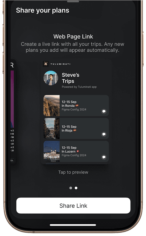 Users can share a live link with all their trips — no extra messages or lists needed