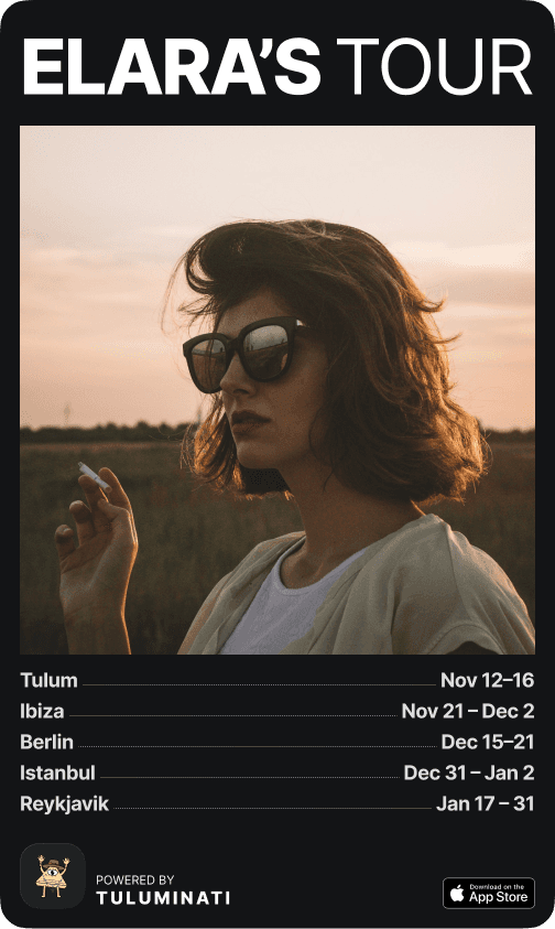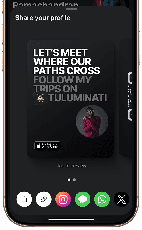 A visual share card designed for social media — so users can invite friends to follow their trips on Tuluminati