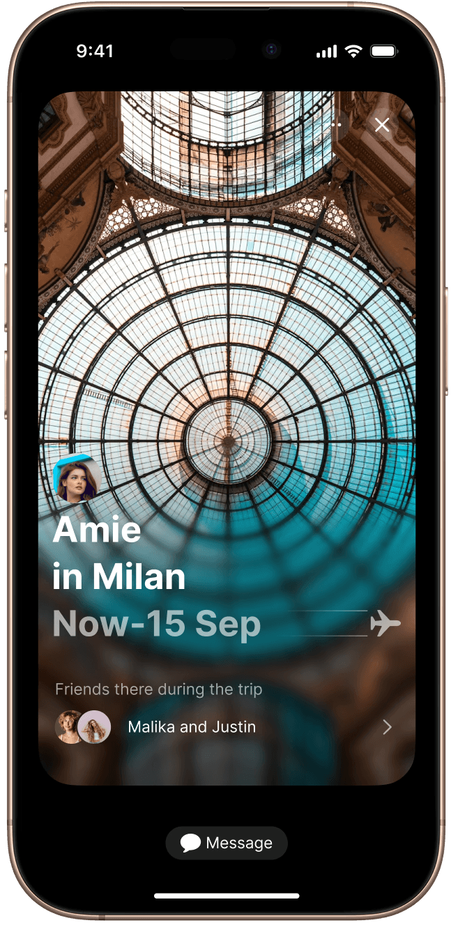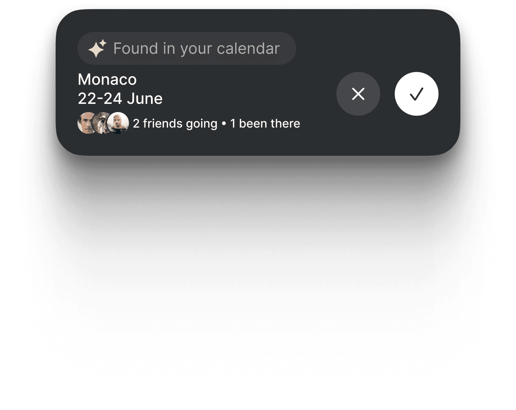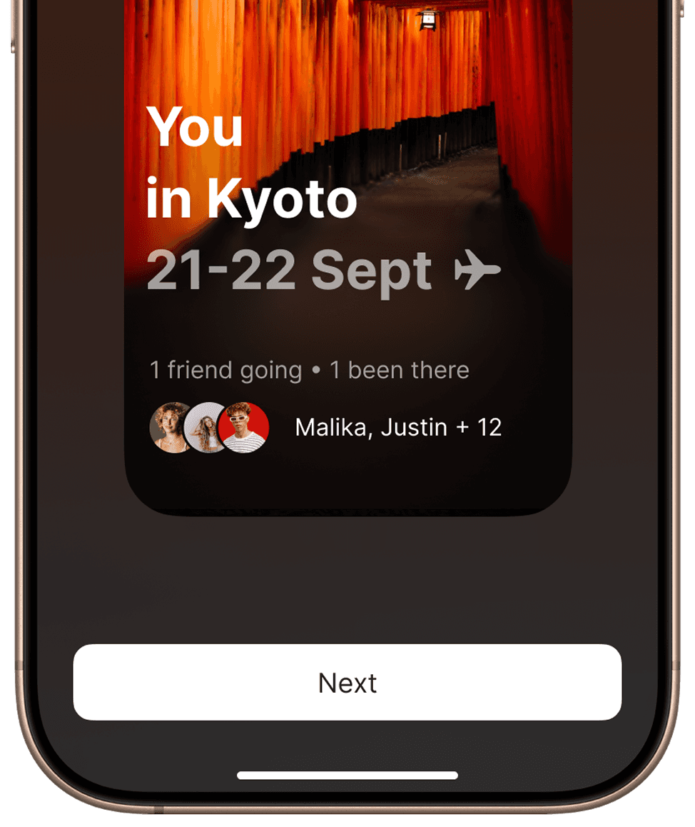 After a one-time calendar sync, users don’t need to open the app. Our AI detects trips automatically and sends a simple notification — showing who might be there too